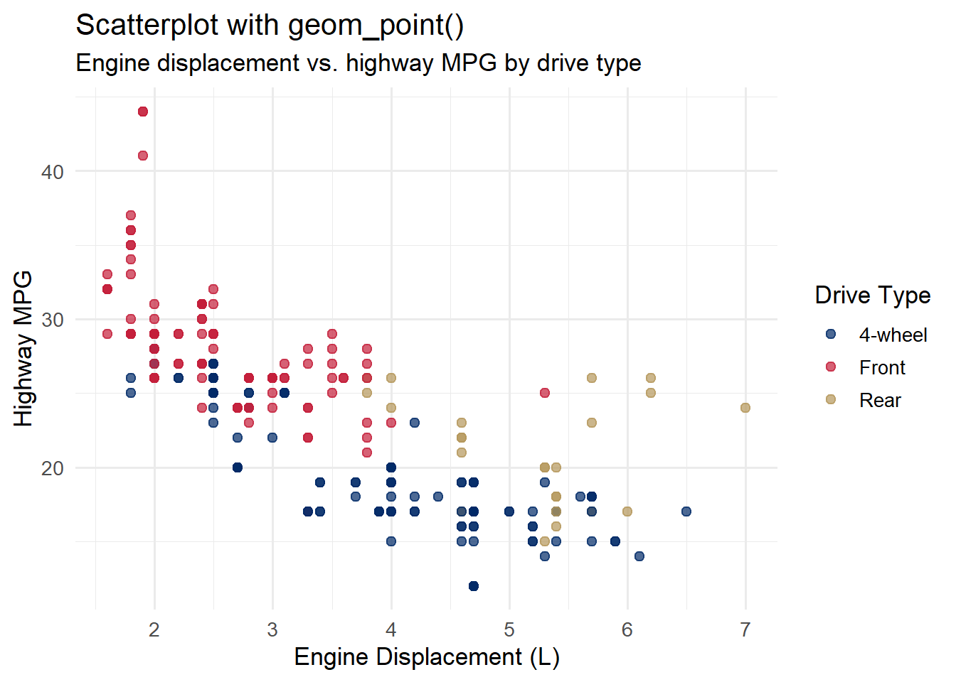 Using the mpg dataset, build a scatterplot of cty (city MPG, x-axis) vs. hwy (highway MPG, y-axis). Fill in the blanks in the template below. Map the drv variable to color using the book’s accent colors, add axis labels and a title, and apply theme_minimal().