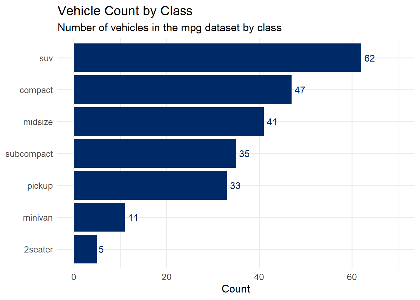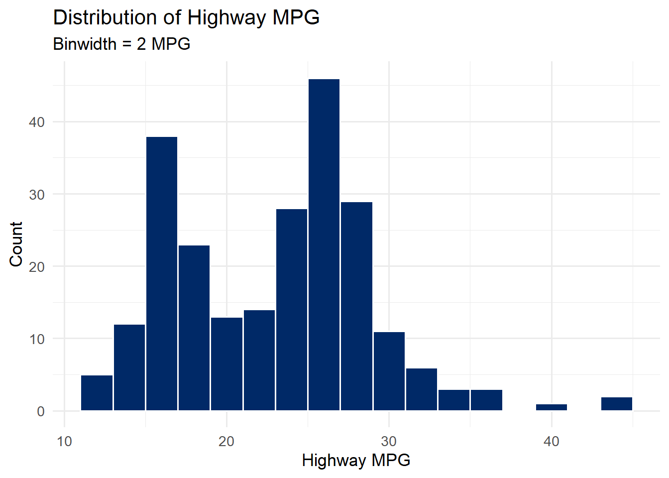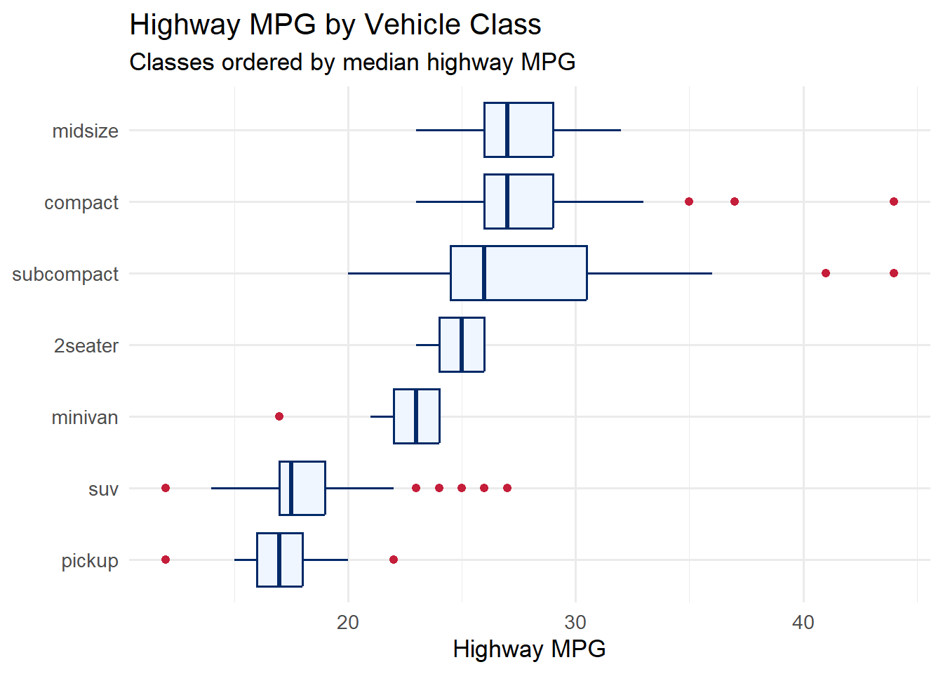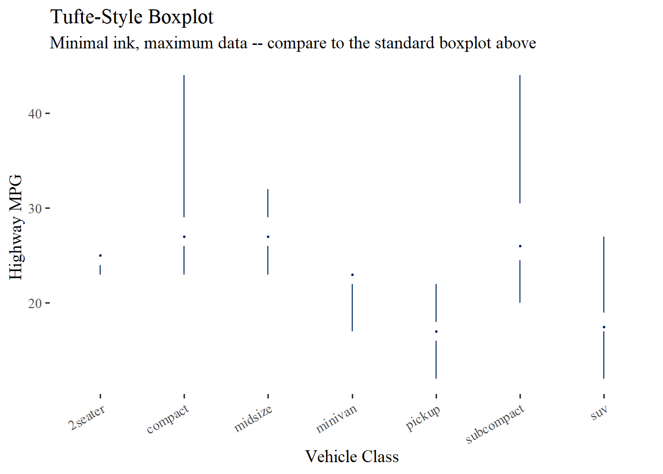 ggplot(mpg, aes(x = class, y = hwy)) +geom_tufteboxplot(color ="#002967") +labs(title ="Tufte-Style Boxplot",subtitle ="Minimal ink, maximum data -- compare to the standard boxplot above",x ="Vehicle Class",y ="Highway MPG" ) +theme_tufte(base_size =13) +theme(axis.text.x =element_text(angle =30, hjust =1))