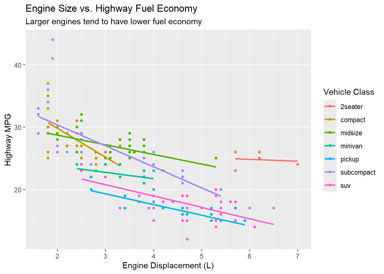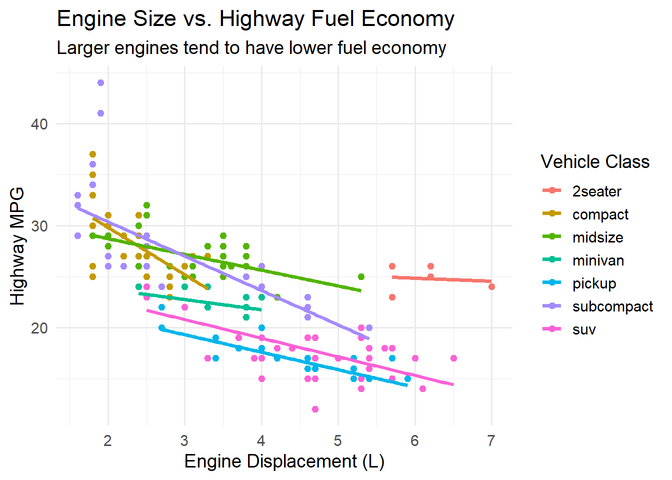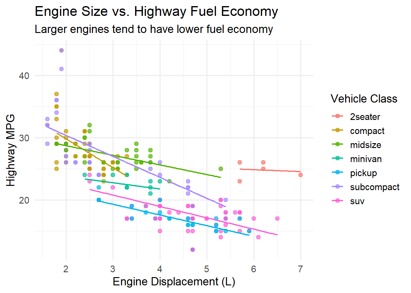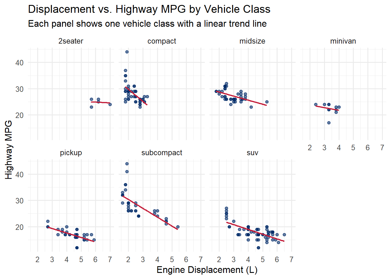 Notice how the faceted view reveals patterns that a single scatterplot obscures. For example, the relationship between displacement and fuel economy is very different for 2-seater sports cars (which are light despite large engines) compared to SUVs.