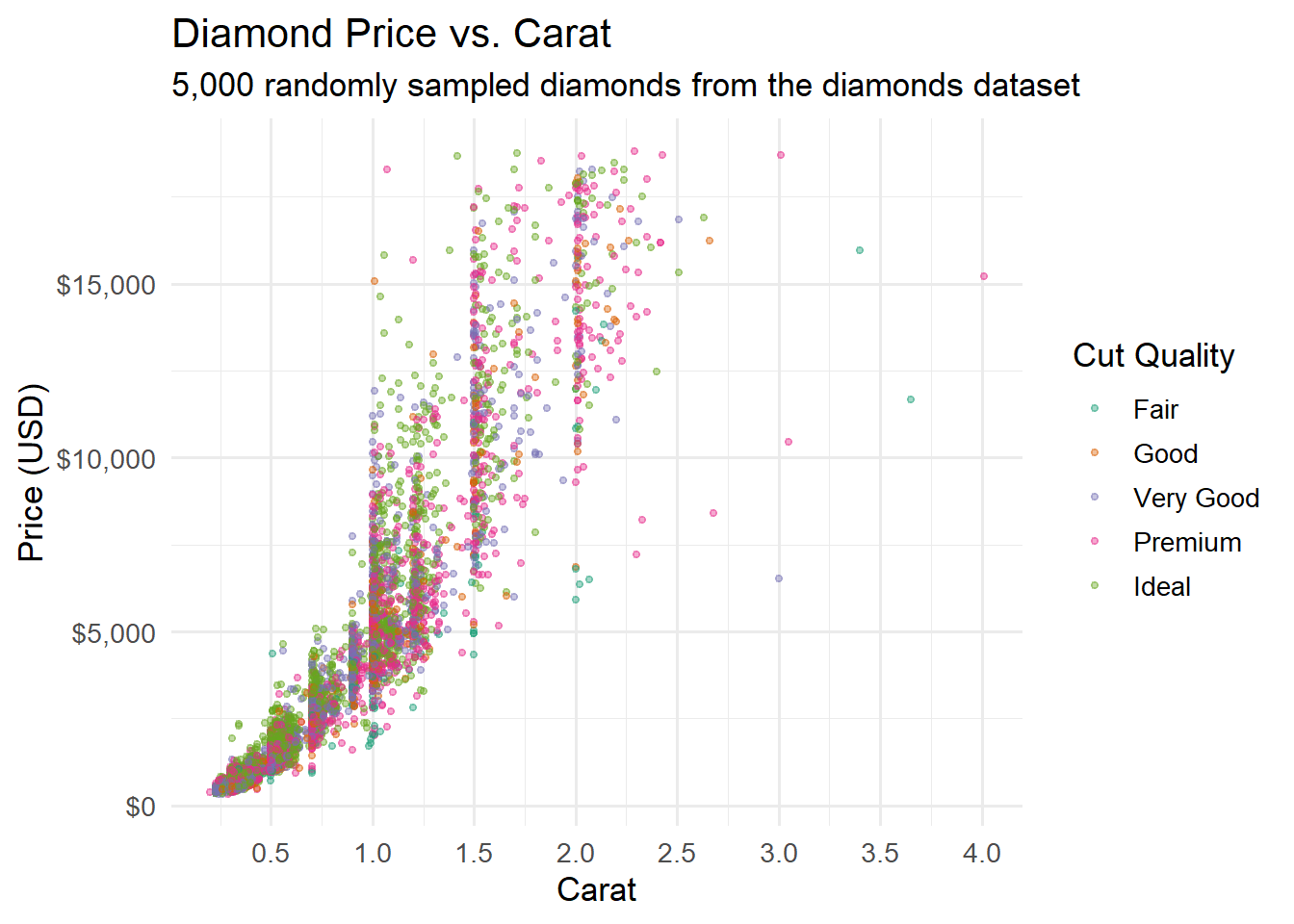 Let us build one more polished visualization that incorporates everything we have learned in this chapter. We will use the diamonds dataset to create a comprehensive view of diamond characteristics: