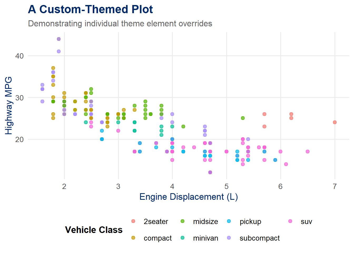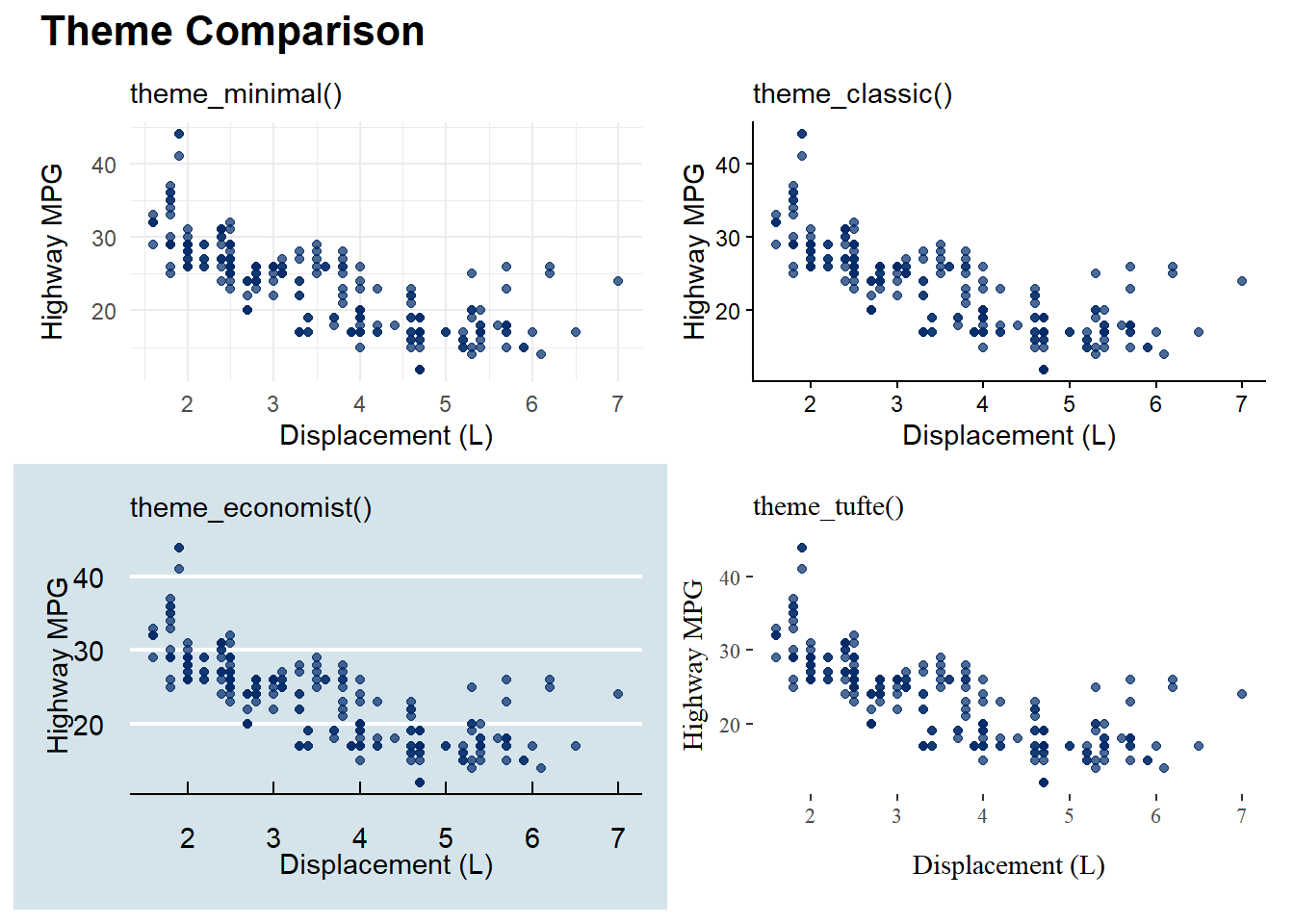 Themes control all of the non-data visual elements of your plot: background colors, grid lines, font sizes, axis tick marks, legend placement, and more. A well-chosen theme can elevate a serviceable plot into a professional, publication-ready graphic.