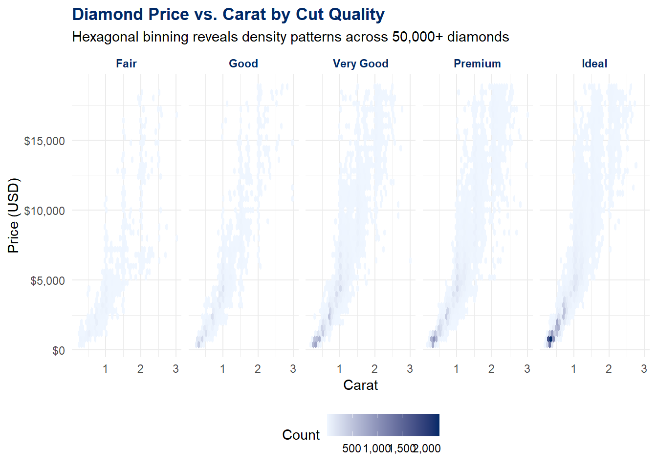 diamonds %>%filter(carat <=3) %>%ggplot(aes(x = carat, y = price)) +geom_hex(bins =40) +scale_fill_gradient(low ="#eff6ff", high ="#002967", labels =comma_format()) +scale_y_continuous(labels =dollar_format()) +facet_wrap(~cut, ncol =5) +labs(title ="Diamond Price vs. Carat by Cut Quality",subtitle ="Hexagonal binning reveals density patterns across 50,000+ diamonds",x ="Carat",y ="Price (USD)",fill ="Count" ) +theme_minimal(base_size =11) +theme(plot.title =element_text(face ="bold", color ="#002967"),strip.text =element_text(face ="bold", color ="#002967"),legend.position ="bottom" )