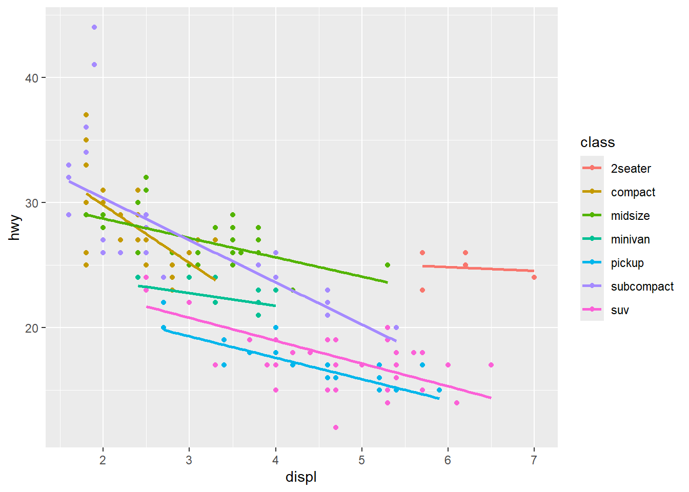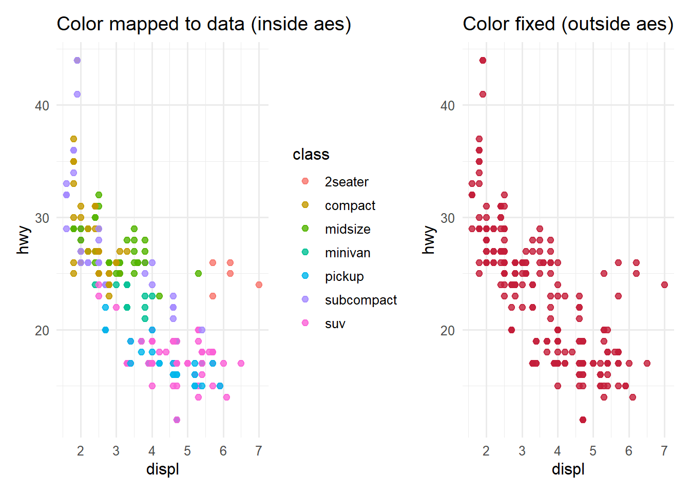 aes(x = displ, y = hwy, color = class)