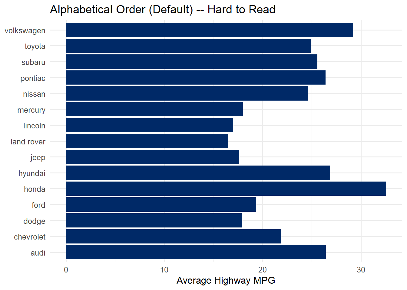 # WITHOUT fct_reorder — alphabetical order (hard to compare)mpg %>%group_by(manufacturer) %>%summarise(avg_hwy =mean(hwy), .groups ="drop") %>%ggplot(aes(x = avg_hwy, y = manufacturer)) +geom_col(fill ="#002967") +labs(title ="Alphabetical Order (Default) -- Hard to Read",x ="Average Highway MPG", y =NULL) +theme_minimal(base_size =12)