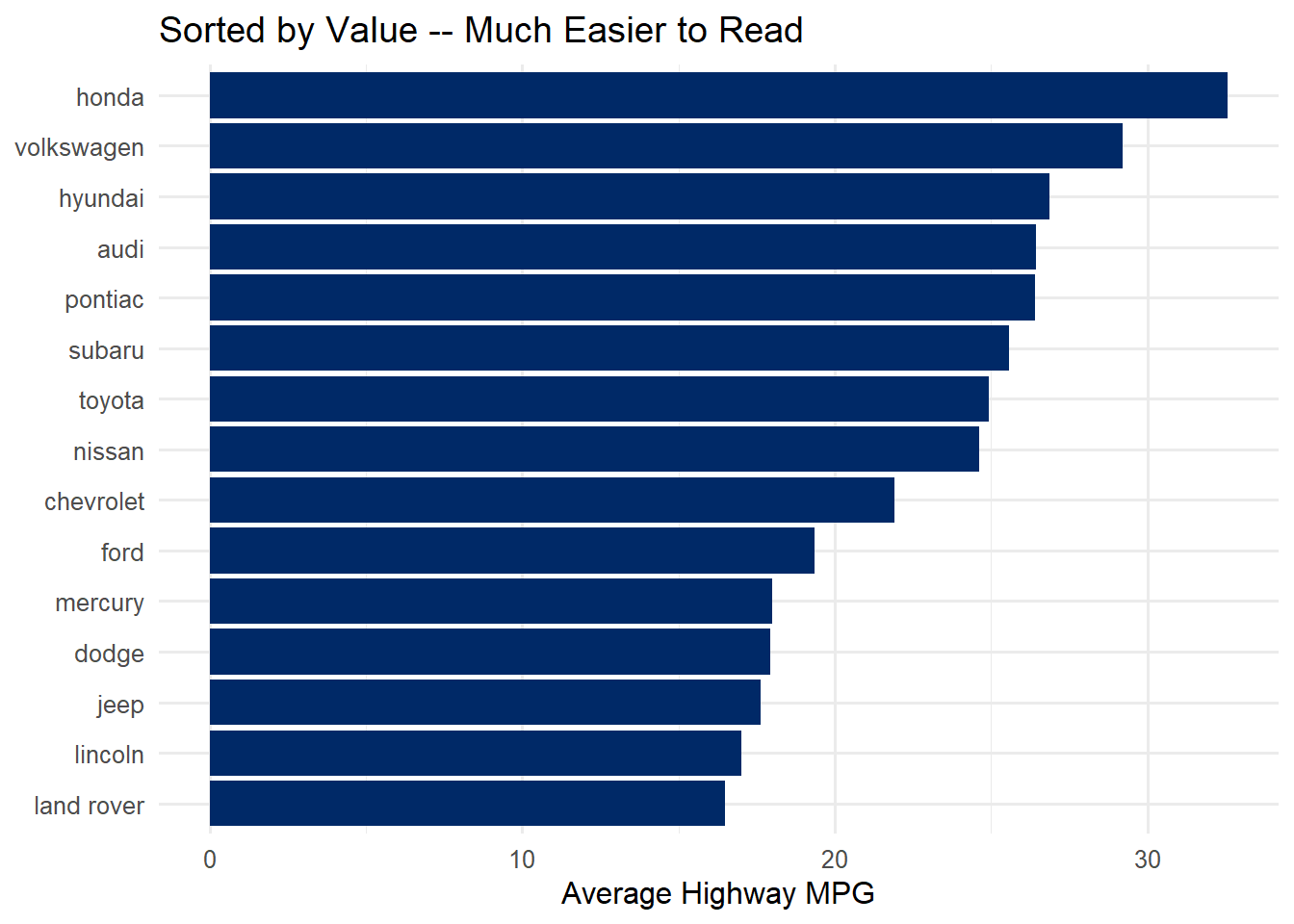 # WITH fct_reorder — sorted by value (easy to compare)mpg %>%group_by(manufacturer) %>%summarise(avg_hwy =mean(hwy), .groups ="drop") %>%mutate(manufacturer =fct_reorder(manufacturer, avg_hwy)) %>%ggplot(aes(x = avg_hwy, y = manufacturer)) +geom_col(fill ="#002967") +labs(title ="Sorted by Value -- Much Easier to Read",x ="Average Highway MPG", y =NULL) +theme_minimal(base_size =12)