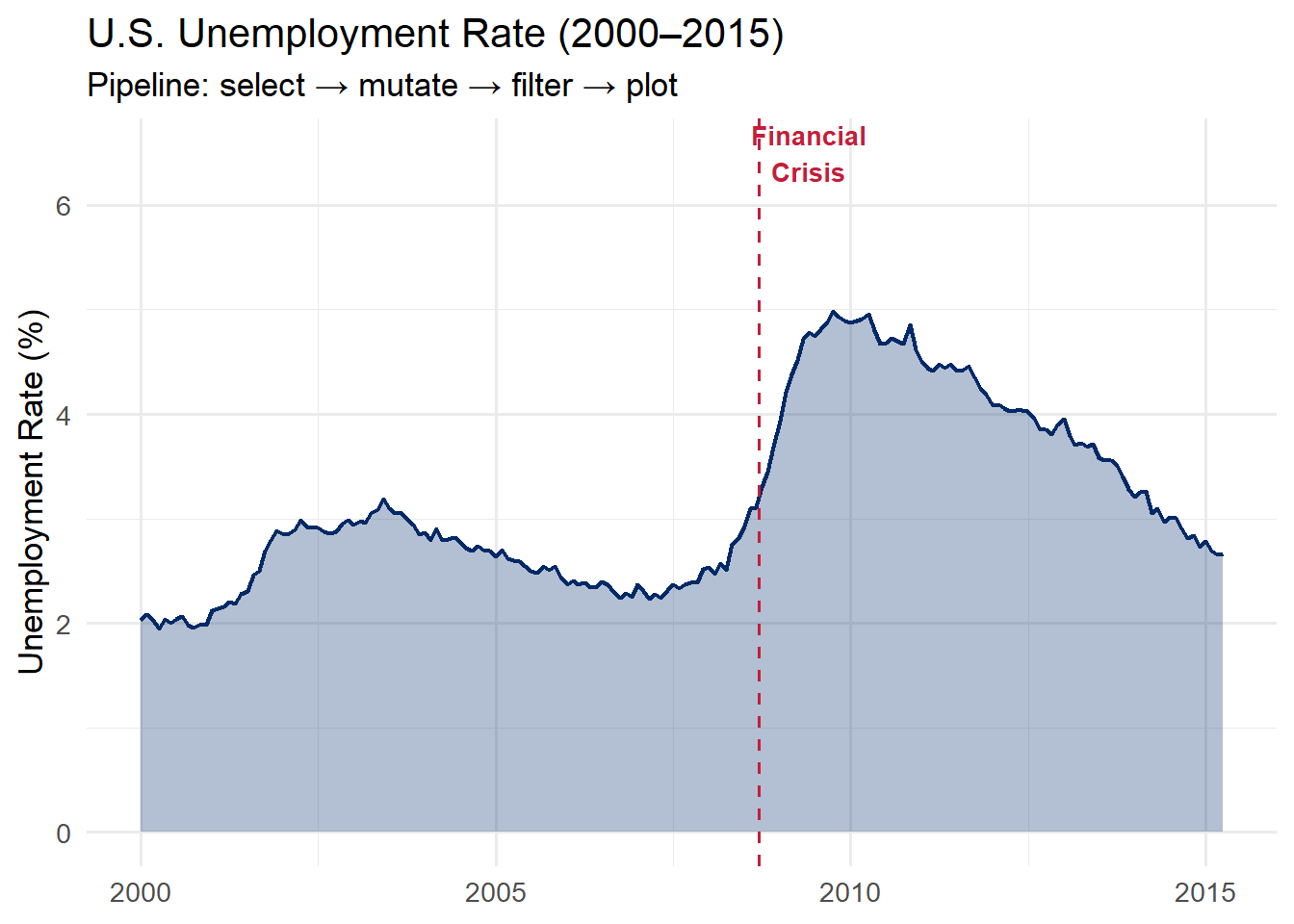 # Store the wrangled data, then plot iteconomics_clean <- economics %>%select(date, unemploy, pop) %>%mutate(unemploy_rate = unemploy / pop *100) %>%filter(date >="2000-01-01")ggplot(economics_clean, aes(x = date, y = unemploy_rate)) +geom_area(fill ="#002967", alpha =0.3) +geom_line(color ="#002967", linewidth =0.8) +geom_vline(xintercept =as.Date("2008-09-15"),linetype ="dashed", color ="#C41E3A") +annotate("text", x =as.Date("2009-06-01"), y =6.5,label ="Financial\nCrisis", color ="#C41E3A",fontface ="bold", size =3.5) +labs(title ="U.S. Unemployment Rate (2000\u20132015)",subtitle ="Pipeline: select \u2192 mutate \u2192 filter \u2192 plot",x =NULL, y ="Unemployment Rate (%)") +theme_minimal(base_size =13)