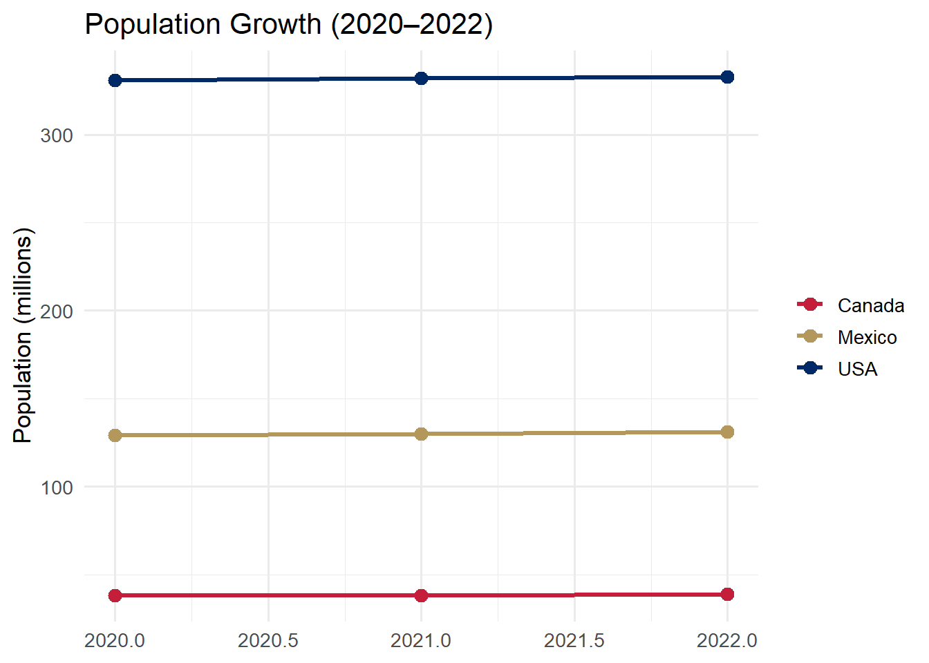 tidy %>%mutate(year =as.integer(year)) %>%ggplot(aes(x = year, y = population_millions, color = country)) +geom_line(linewidth =1.2) +geom_point(size =3) +scale_color_manual(values =c("USA"="#002967","Canada"="#C41E3A","Mexico"="#B4975A")) +labs(title ="Population Growth (2020\u20132022)",y ="Population (millions)", x =NULL, color =NULL) +theme_minimal(base_size =13)